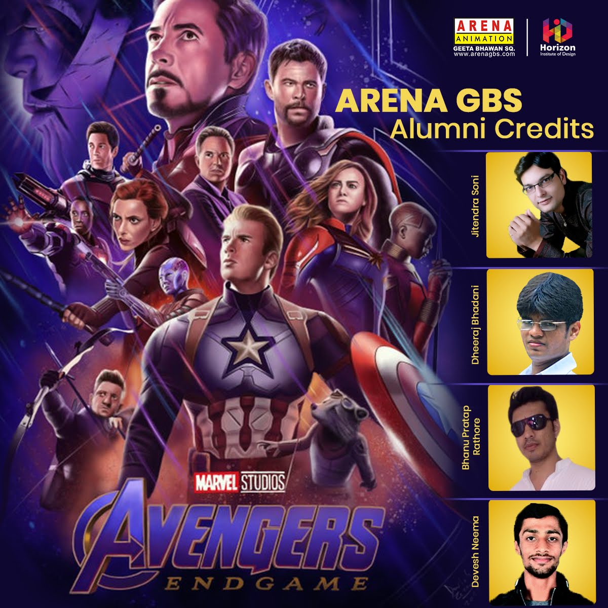 Avengers End Game- nomination. https://www.imdb.com/title/tt4154796/?ref_=fn_al_tt_2 Credits for our alumni Dheeraj Bhadani- https://www.imdb.com/name/nm9575964/?ref_=fn_al_nm_1 , Jitendra Soni- https://www.imdb.com/name/nm11059019/?ref_=fn_al_nm_2 Devesh Neema- https://www.imdb.com/name/nm11012654/?ref_=fn_al_nm_1 Bhanu Pratap Rathore- https://www.imdb.com/name/nm11370968/?ref_=nv_sr_srsg_0