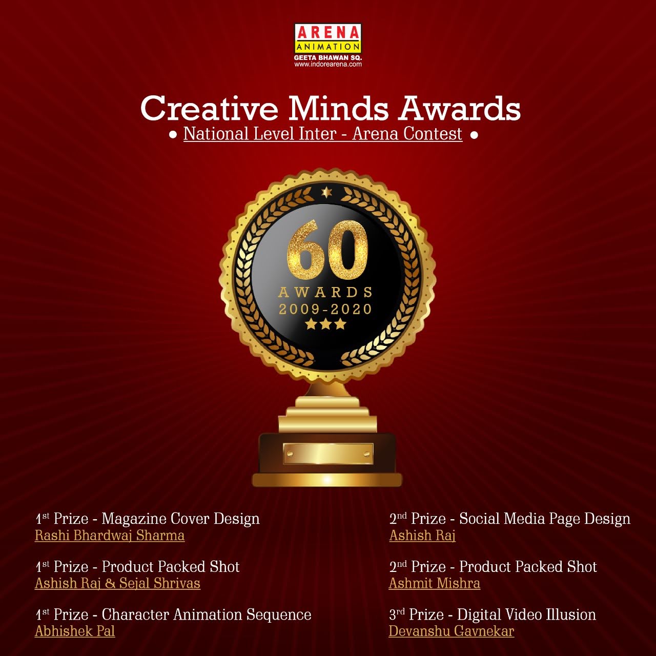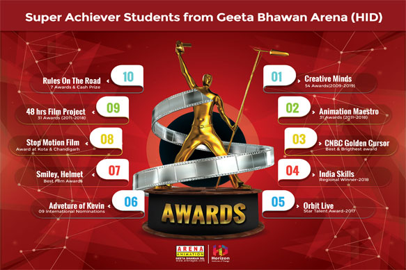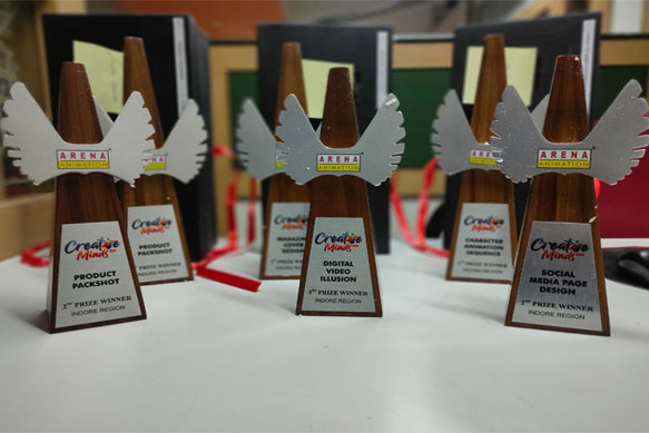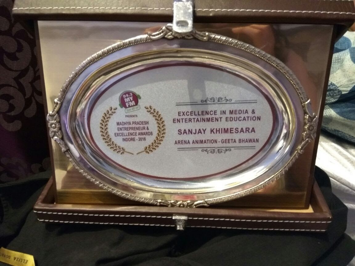 Trailblazers of Education in MP , Icons of Industry, M.P. Entrepreneur & Excellence Award, National Excellence Award for Outstanding Contribution to Socio-Economic Development, India Education Excellence Award as “Best Digital Media & Animation Academy of Central India”, Arena Excellence Award for being amongst Top 10 in National Placement & Star Performer LMS during Session: 2013-14 & 2014-15 , Appreciation & Award by M.P.Police for PRTS during 2012-13 & 2013-14, 19, Captains of the Industry in M.P. by CM, MP State, Icons of the Industry, Consecutive Excellence Award for Best performance in Training, Placements & Quality Audits within Arena brand for Pune Region(Central Province) during 1997-2017 & Quality Audit Certificate, Best Placement Award