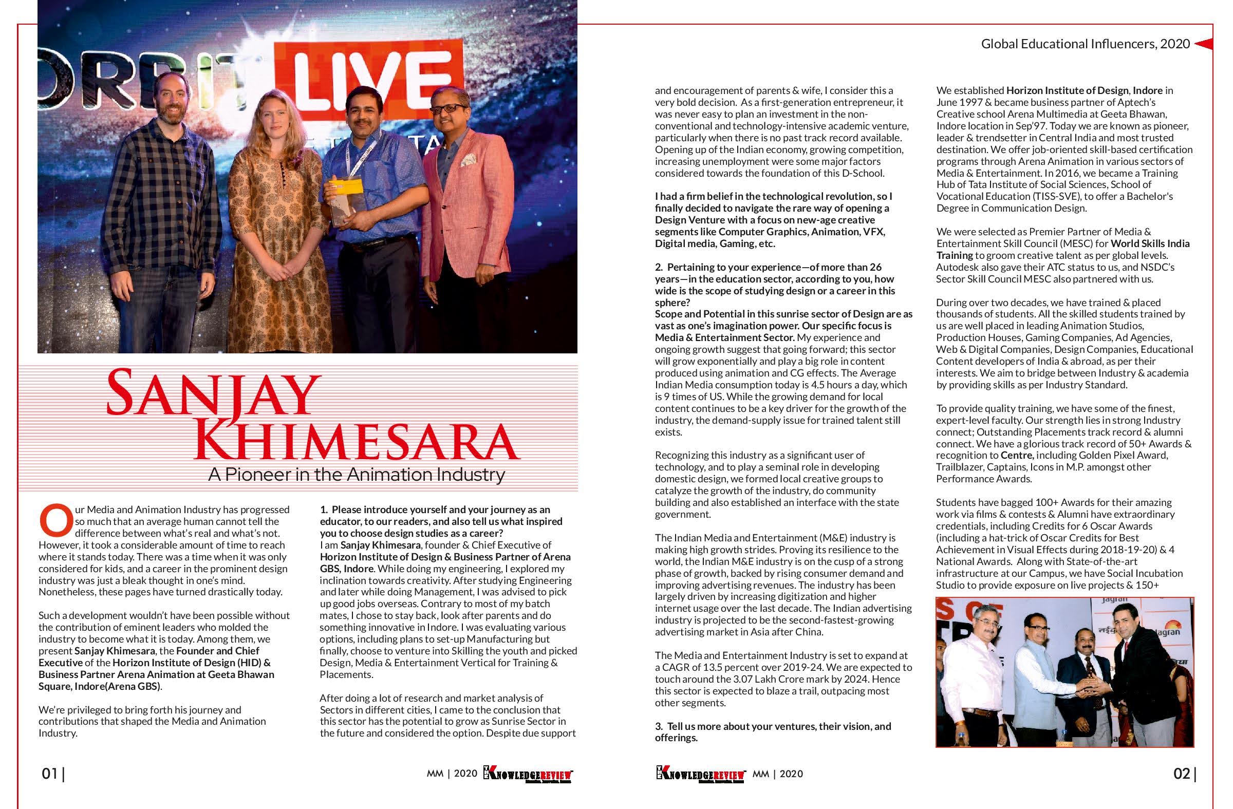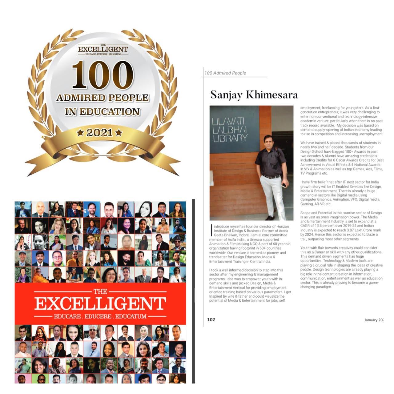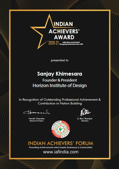 Indian CSR Award 2021 as Vocational initiative of the year, Humanitarian Excellence Award 2021, Indian Achiever's Award-2021, Red Achiever-2020, Panellist at CII Summit Fx2021, Vidyadaan by FICCI/MESC, Indian CSR, 100 Admired People in Education, Global Educational Influencers, 2020 by Knowledge Review, Achiever of the Year-2019 by Tata Institute of Social Sciences, SVE (M & E Vertical), Golden Pixel Award-2019 as Backbone of Indian AVGC Industry, Animation Mentor by Maharashtra Cosmopolitan Education Society, Pune in Jan’2019, Gurukul Jyoti Certificate of Honor, Certified Career Coach by Mentoria & Mindler National level Awards to Students- Orbit Live, Star Talent Award to , 7 Award to Student Animation Film Rules on the Road by Indore Traffic Police(created by 26 students), Gujarat One Minute Film Festival, Chandigarh International Film Festival, Chitrabharti Film Festival, Do Good Karma Fest, Hyderabad, U Special International Film Festival, First Cut Film Festival (FAME, Pune). Total Rs.50000 as cash prizes, Stop Motion Animation Film Adventure of Kevin got Nominations at Kinephone Film Fest, Tiff Video Challenge, OakVille Festival of Film & Art, I-phone Film Fest, Indevise Free Virtual Fest, Premio Cenemetographiko Pelena, Film Helmet & Masoom got Award by Safe India Foundation, Toilet-Ek Soch Sureksha ke liye & Soil got Award at Chambal Film Festival, Kota & Chandigarh University Film Fest in 2019 with Rs.3100 Cash Award. India Skills Regional Selection 2021 for Shanghai 2022 to Batul Ali- Graphics.