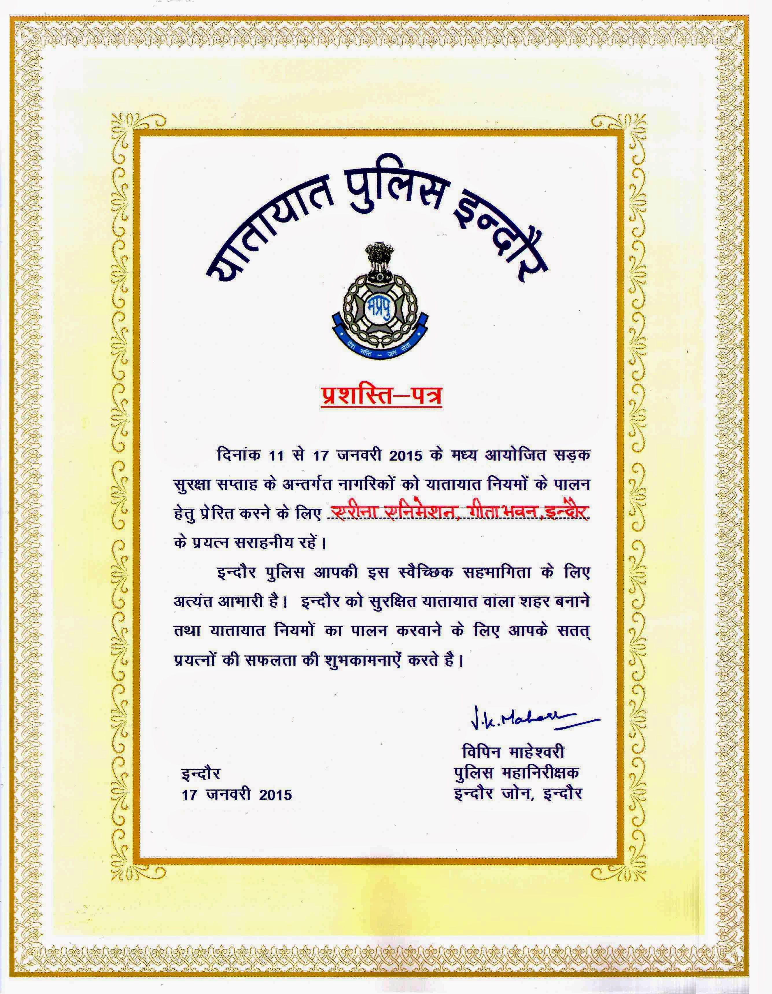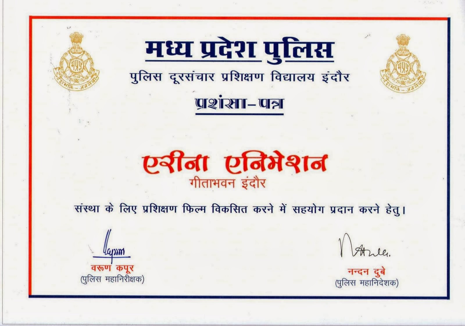 Awards & Contracts, Creative Minds -60 Awards, Alumni Credits- Arjun Award to Student for Badminton, MP Police Medical Health Security AV Film got Certificate of Honor by State Police Department & Scheme got Sanctioned impacted 1L policemen families of state, Student became First runner up in Regional Round for Graphic Design & Qualified for national level Skill Championship organized by Ministry of Skills & NSDC